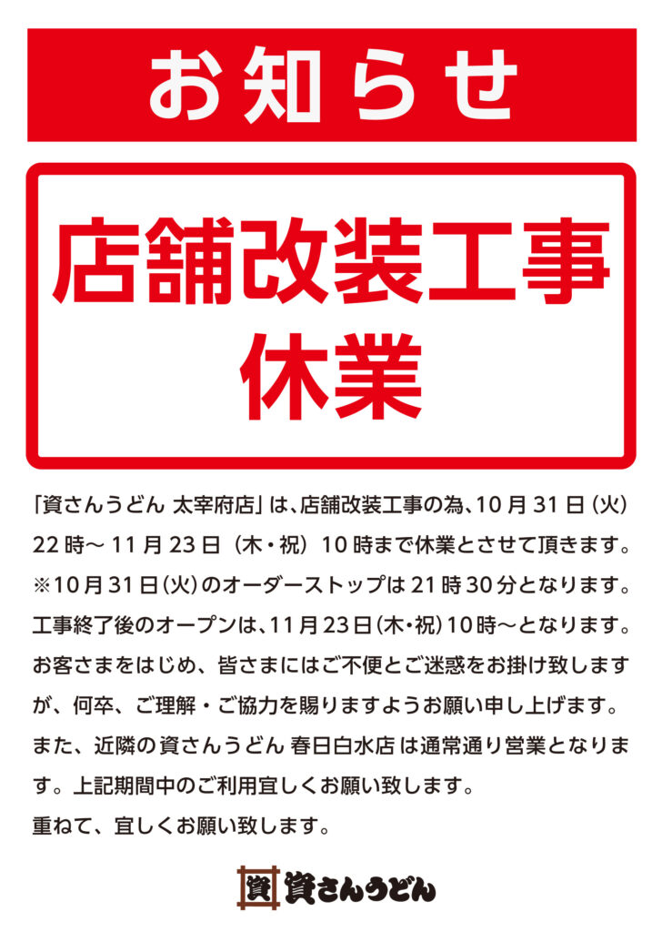 「資さんうどん太宰府店」は、店舗改装工事の為、10月31日(火)22時~ 11月23日(木・祝)10 時まで休業とさせて頂きます。※10 月31日(火)のオーダーストップは21時30 分となります。