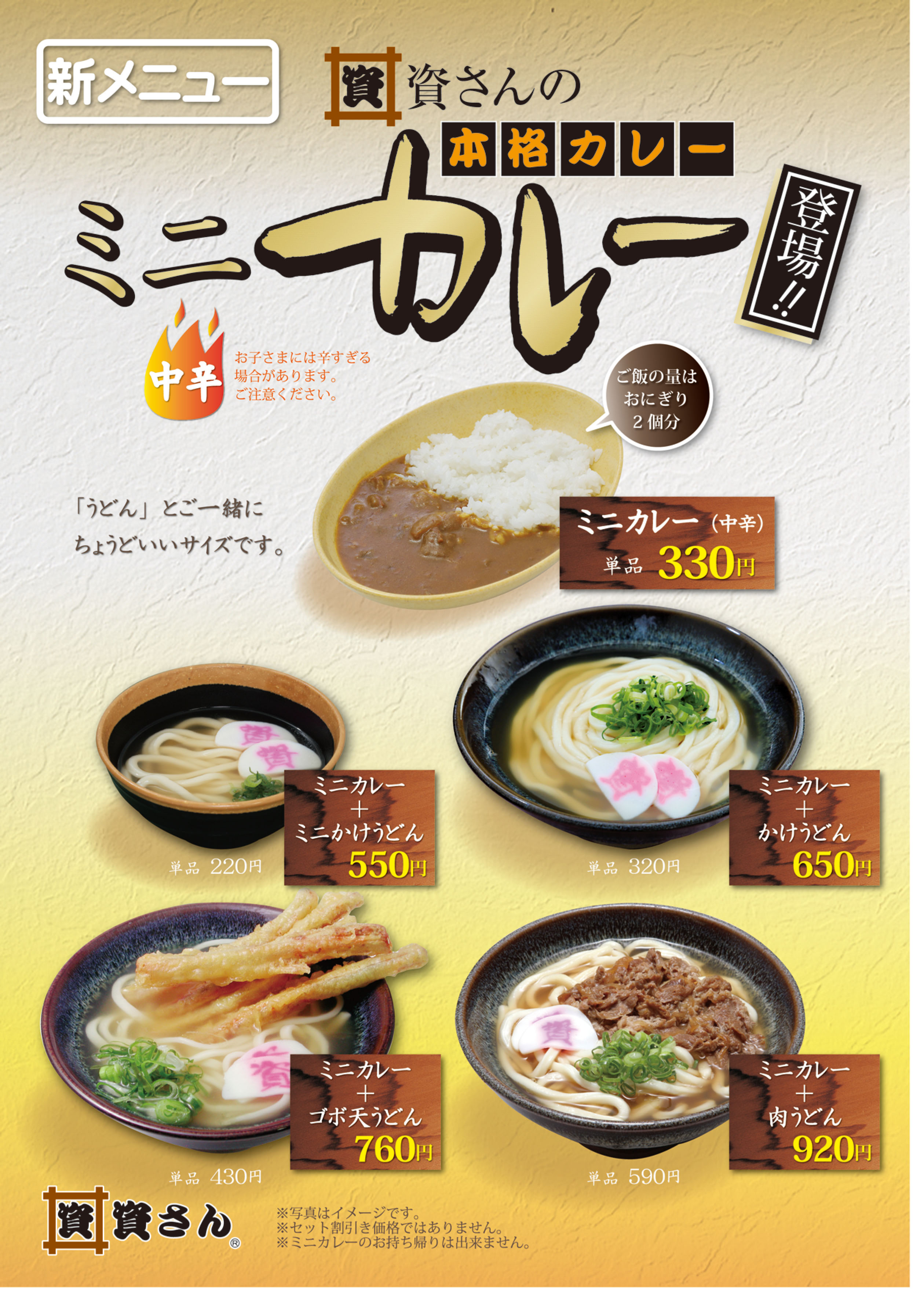 2017年12月01日 ミニカレー販売開始 12月1日より、資さんうどん全店舗で、ミニカレーの販売を開始いたします。 うどんとご一緒にちょうどいいサイズです。ミニカレー単品330円。 資さんのカレーと同じ「中辛」ですので、お子様や辛いものが苦手な方はご注意ください。