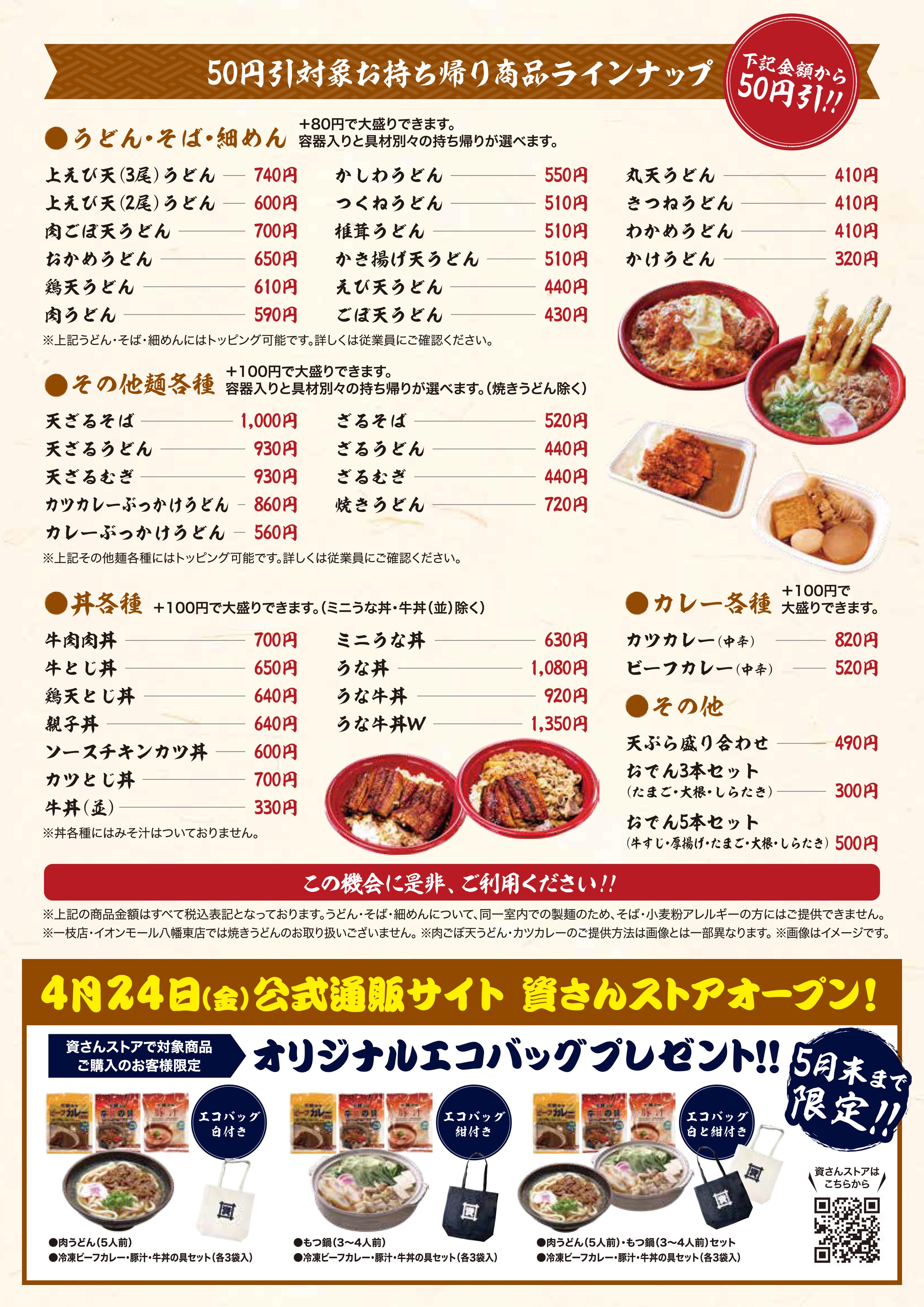 ご自宅や職場等でのお食事需要のさらなる高まりを受け、より多くの「資さんうどん」のお持ち帰り商品を気軽にご利用頂けるよう、うどん・丼・カレー等各種商品(全41品)を、お持ち帰りのみ5月9日(土)~6月30日(火)までの期間限定で、お試し価格として、50円引にてご提供します。対象商品として、多くの人気商品をラインナップ!「資さんうどん」のお持ち帰り商品は、ご自宅や職場等で「店舗の味をそのまま味わえる」と皆さまからも多くのありがたいお言葉を頂いております!この機会にぜひ、ご賞味ください!!
