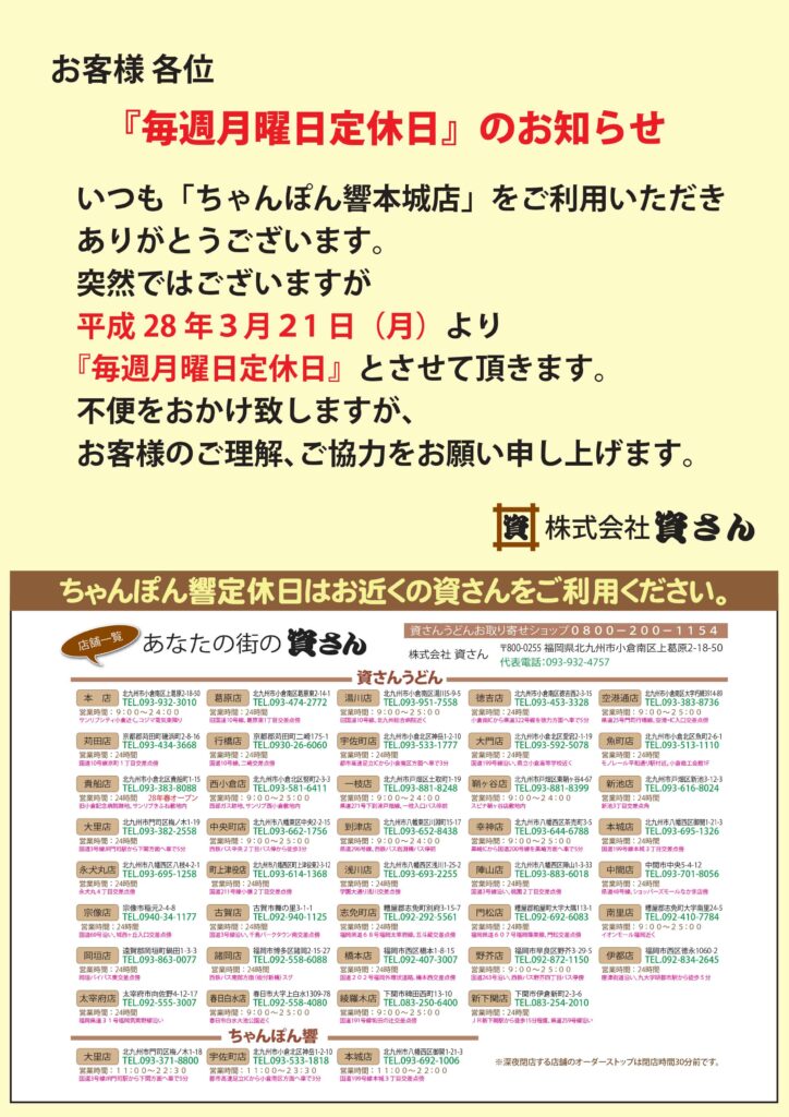 2016年03月17日 ちゃんぽん響本城店ご利用のお客様へ 3月21日(月)より、ちゃんぽん響本城店は、毎週月曜日を定休日とさせていただきます。 お客様にはたいへんご不便をおかけしてしまい誠に申し訳ございません。 なにとぞご理解賜りますようお願い申し上げます。