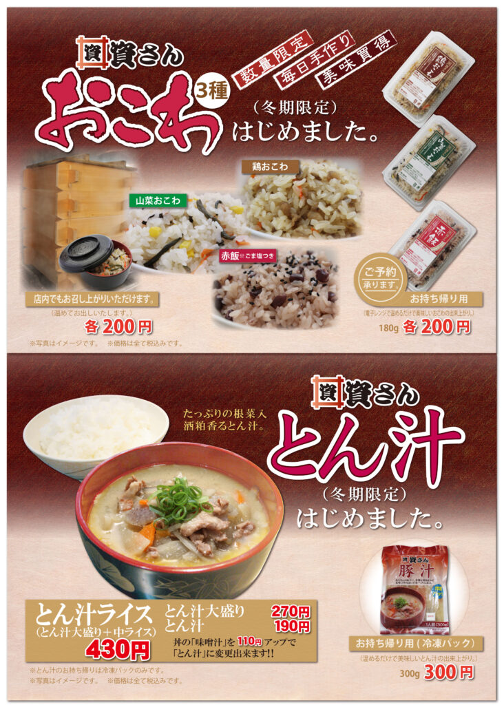 2016年09月27日 10月1日から冬メニュー開始 お待たせいたしました。10月1日(土曜日)より冬メニューがスタートします。 鶏おこわ・山菜おこわ・赤飯 各200円。 とん汁190円 とん汁大盛270円。 ご来店をお待ち申し上げております。