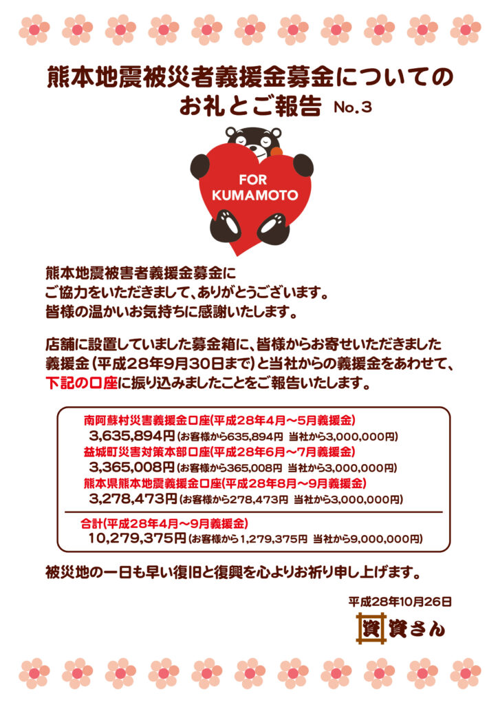 2016年10月26日 熊本地震義援金募金のお礼とご報告 お客様の温かいお気持ちに心から感謝いたします。貼付画像のとおり、寄付を行いましたことをご報告申し上げます。 一日も早い復旧復興をお祈りしております。