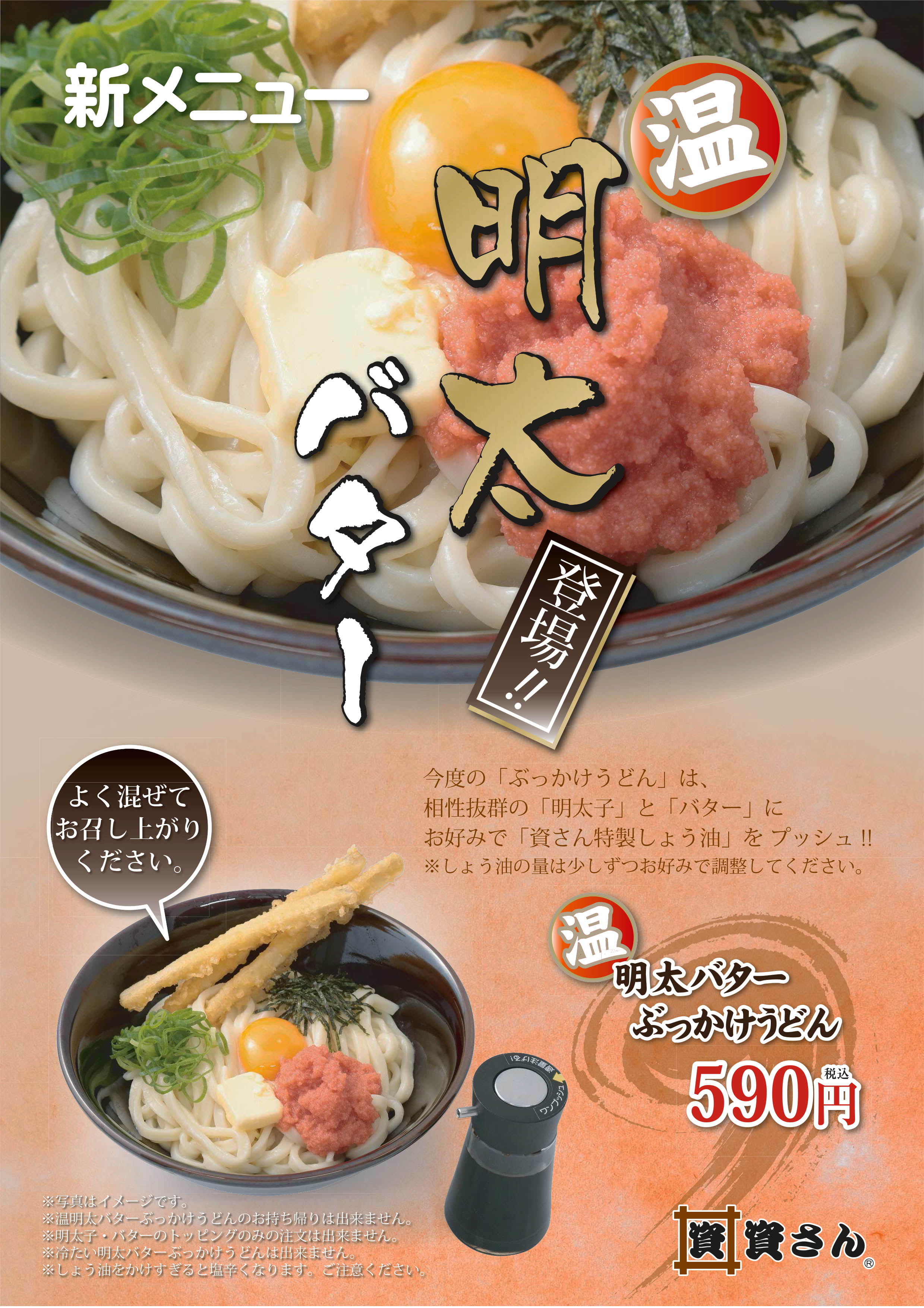 2016年11月28日 新メニューのお知らせ:温・明太バターぶっかけうどん 12月1日より資さんうどん全店舗で、温・明太バターぶっかけうどんを始めます。590円。 他のぶっかけうどんのように「だしつゆ」をかけるのでなく、特製の「濃口かえし醤油」を数滴垂らして、良くかき混ぜてお召し上がりください。 専用のプッシュ式醤油差しをご用意しております。2~3回プッシュしてお好みで調整してください。