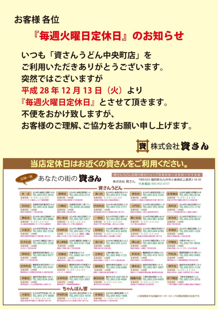 2016年12月07日 資さんうどん中央町店 火曜定休日のお知らせ 日頃より資さんうどん中央町店をご愛顧賜りありがとうございます。 中央町店は12月13日(火曜)より、毎週火曜日を定休日とさせていただきます。 お客さまにはご不便をおかけいたしますが、何卒ご理解賜りますようお願い申し上げます。