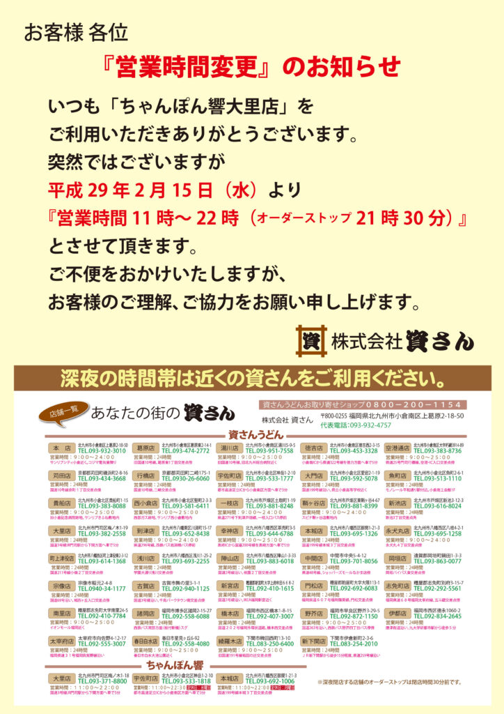 2017年02月08日 ちゃんぽん響大里店 営業時間変更のお知らせ ちゃんぽん響大里店は、2月15日(水)より、営業時間を11時~22時(オーダーは~21時30分)とさせていただきます。 閉店時間が30分早まります。 お客さまにはご不便をおかけいたしますが、何卒ご理解ご協力のほどお願い申し上げます。