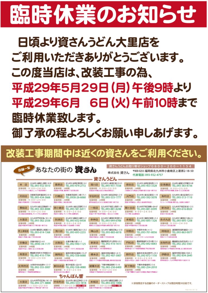 2017年05月16日 資さんうどん大里店 改装工事休業のお知らせ 資さんうどん大里店は、下記日程にて改装工事のため臨時休業いたします。 5月29日(月)21時~6月6日(火)10時。 お客さまにはたいへんご不便をおかけいたしますが、何卒ご理解賜りますようお願い申し上げます。