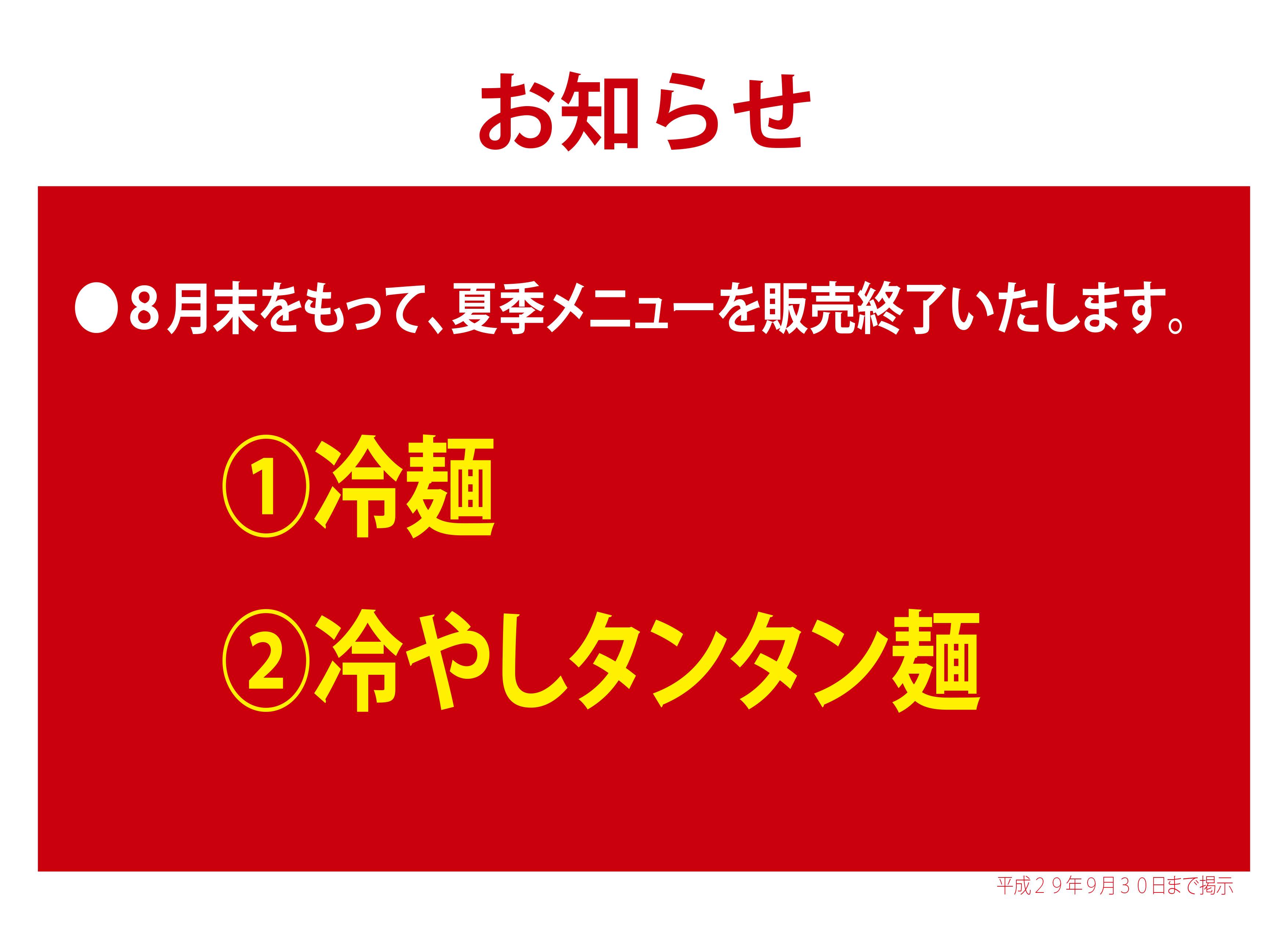 2017年08月24日 8月末日、夏季メニュー終了のお知らせ 資さんうどん及びちゃんぽん響では、8月31日をもって夏季メニューを終了いたします。 (うな丼につきましては、在庫の都合上、店舗によっては早めに終了する場合がございます。) どうぞよろしくお願い申し上げます。