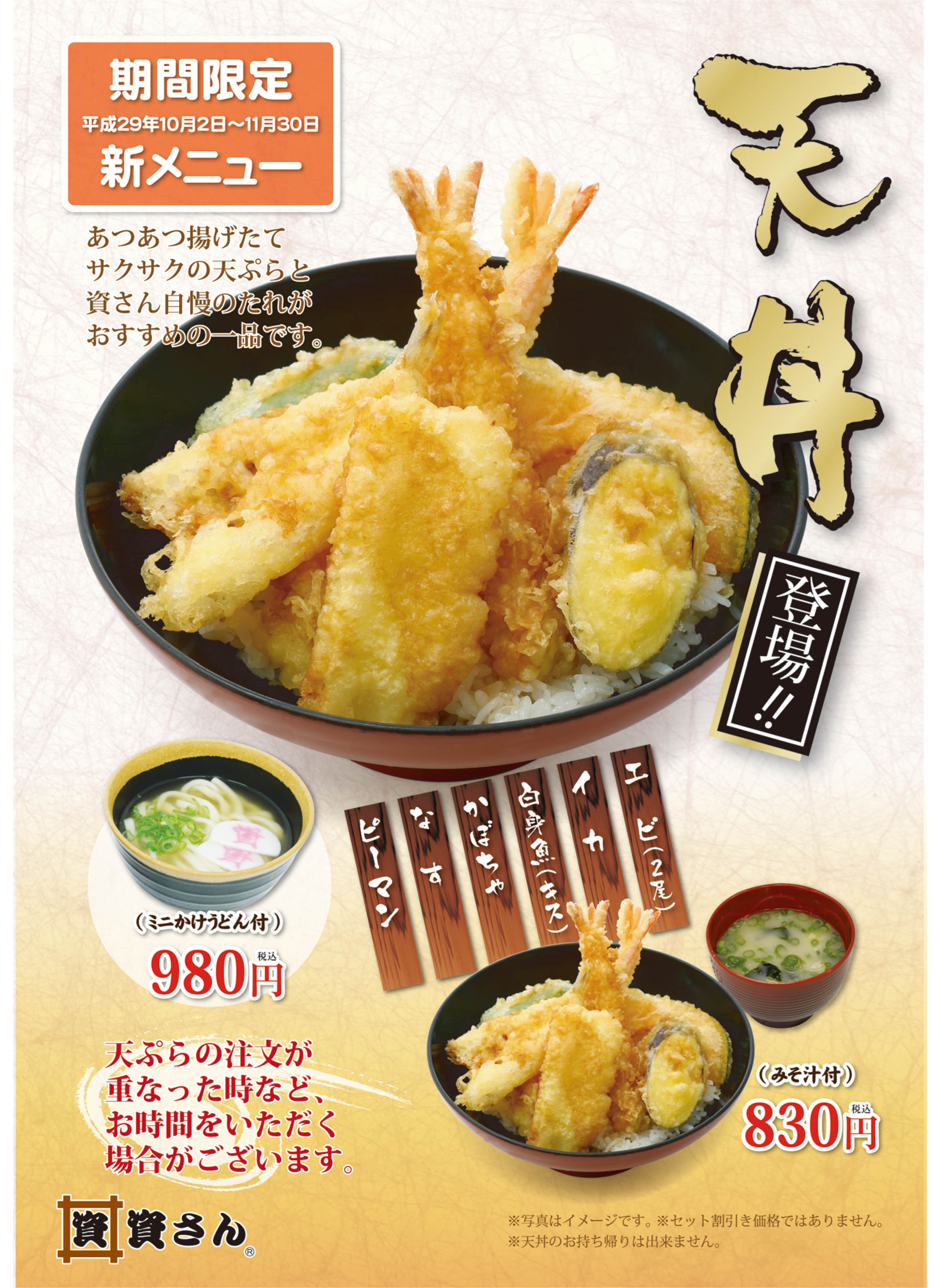 2017年09月26日 期間限定新メニュー 天丼 資さんうどん全店舗にて、10月2日より「天丼」を始めます。 11月30日までの2ヶ月間限定メニューです。 味噌汁付830円、ミニうどん付980円。 ピーク時に天ぷらの注文が重なった時にはお時間を頂くことがございますので、注文時スタッフにお確かめください。 どうぞよろしくお願い申し上げます。