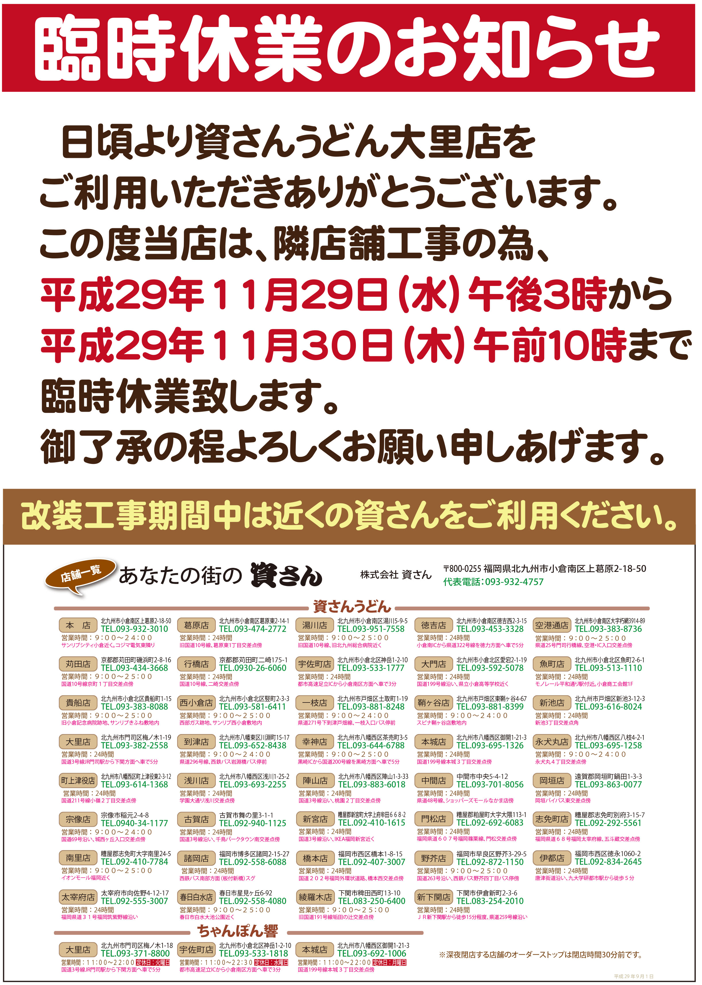2017年11月10日 資さんうどん大里店 臨時休業のお知らせ 資さんうどん大里店は、隣接するちゃんぽん響の改装工事のため、下記日程にて臨時休業いたします。 11月29日(水)午後3時~11月30日(木)午前10時 お客様にはたいへんご迷惑をおかけいたしますが、何卒ご了承賜りますようよろしくお願い申し上げます。