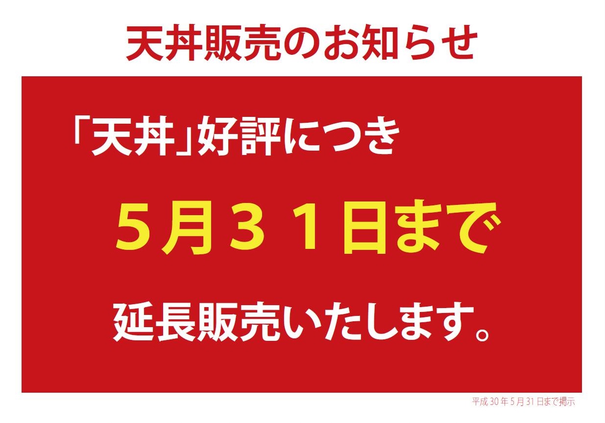 2018年04月26日 天丼 延長販売のお知らせ 期間限定の人気丼「天丼」をご好評につき、5月1日~5月31日まで延期販売いたします。 昨年秋に期間限定で販売し、多くのお客様から再開のご要望をいただいた人気メニューです。 ご注文が重なった時は少々お時間をいただくこともございますが、どうぞよろしくお願いいたします。