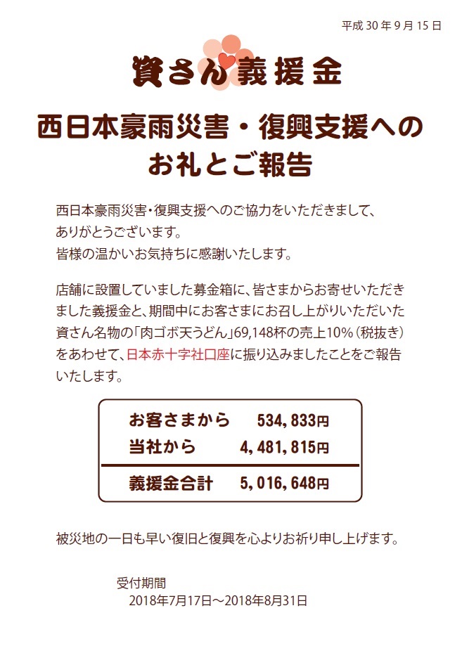 店舗に設置していました募金箱に、皆さまからお寄せいただきました義援金と、期間中にお客さまにお召し上がりいただいた資さん名物の「肉ゴボ天うどん」69,148杯の売上10%(税抜き)をあわせて、日本赤十字社口座に振り込みましたことをご報告いたします。