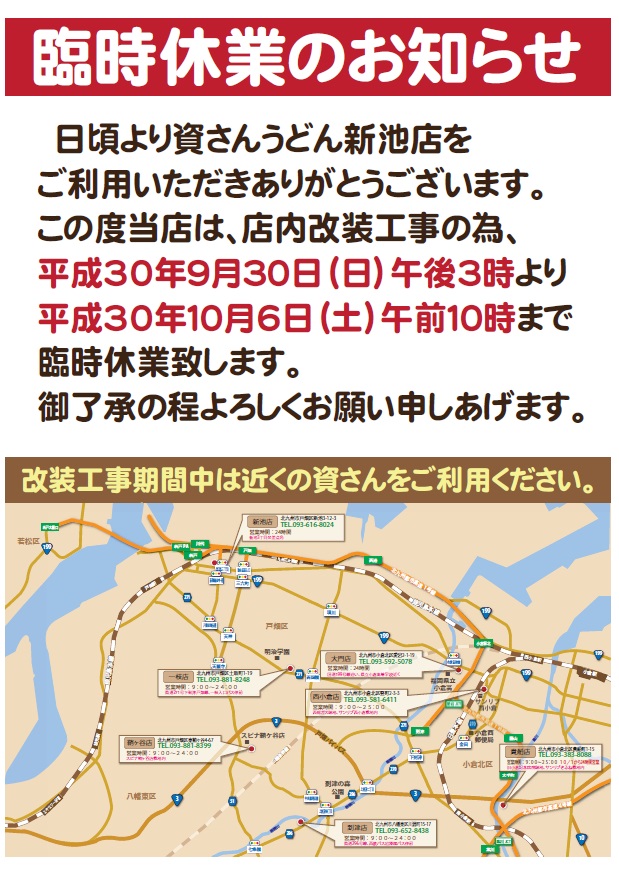 2018年10月05日 資さんうどん新池店 改装工事休業のお知らせ 日頃より資さんうどんをご利用いただきありがとうございます。 資さんうどん新池店は、下記期間改装工事のため臨時休業いたします。 平成30年9月30日(日)午後3時~10月6日(土)午前10時 お客様にはたいへんご迷惑をおかけいたしますが、何卒よろしくお願い申し上げます。