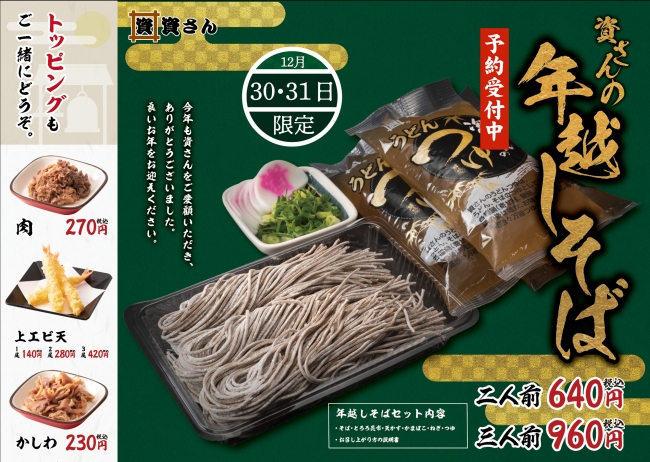 2018年12月11日 お持ち帰りの“年越しそば”絶賛予約受付中! 日頃より資さんうどんをご利用いただきありがとうございます。 大晦日に向けて今年も“年越しそば”の予約受付をスタートしました! お持ち帰り“年越しそば”3人前 資さんうどんの“年越しそば”は、お子さまにも安心してお召し上がりいただけるよう 食品添加物を一切使用せず、そば粉と小麦粉と水のみで製造したこだわりの自家製麺です。 みなさまのご予約お待ちしております!