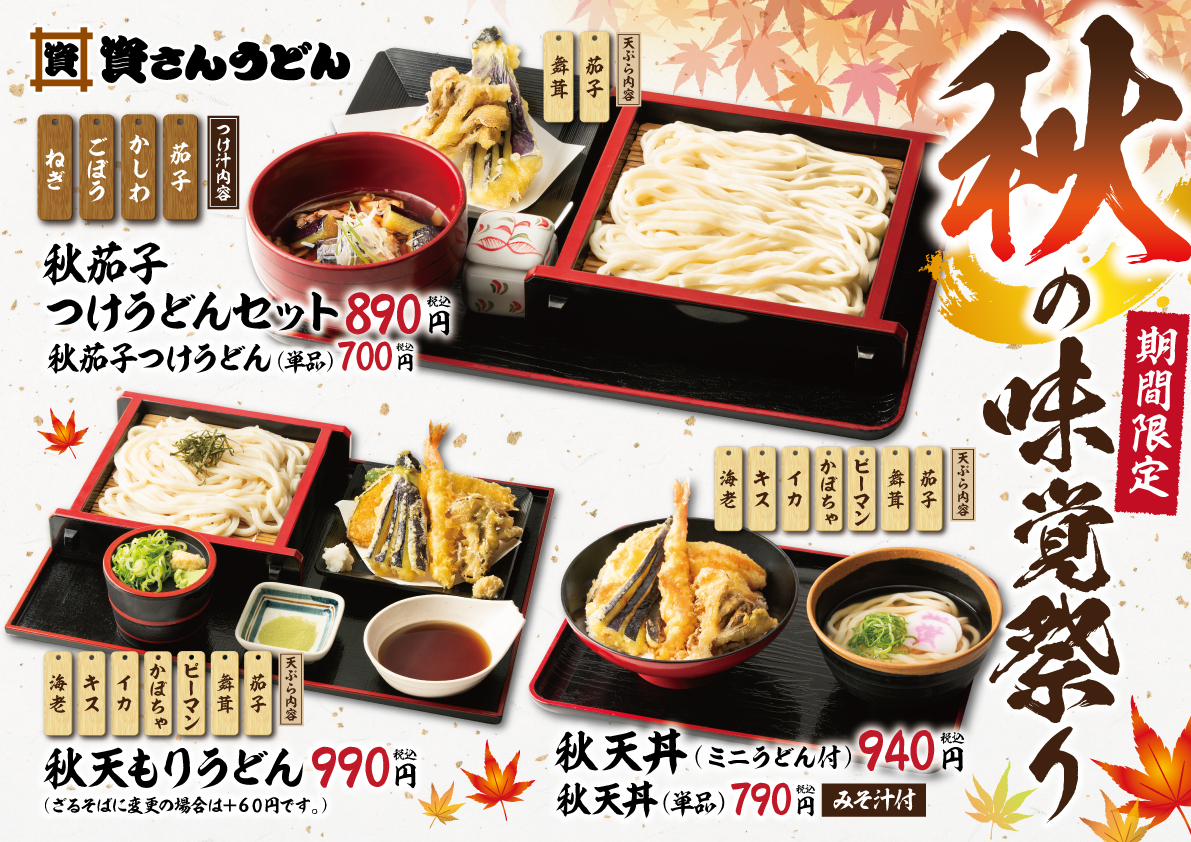 8月26日(月)より、「秋の味覚祭り」を開催!資さんうどん初のつけうどんメニュー「秋茄子つけうどんセット」も新登場!「秋の味覚祭り」で、食欲の秋を楽しみましょう!