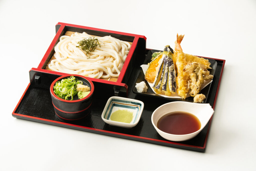 秋の天もり(茄子、舞茸、ピーマン、かぼちゃ、イカ、キス、海老)と冷たいざるうどんのセット。揚げたての旬の天ぷらが、冷たいうどんによく合います。
