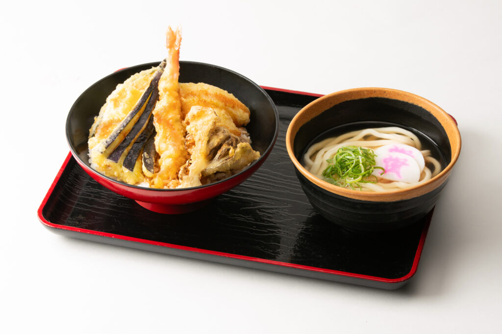 秋が旬の茄子、舞茸に加え、定番のイカ、かぼちゃなど7種の天ぷらが楽しめる秋天丼。資さんうどん特製の自家製たれとの相性も抜群です。