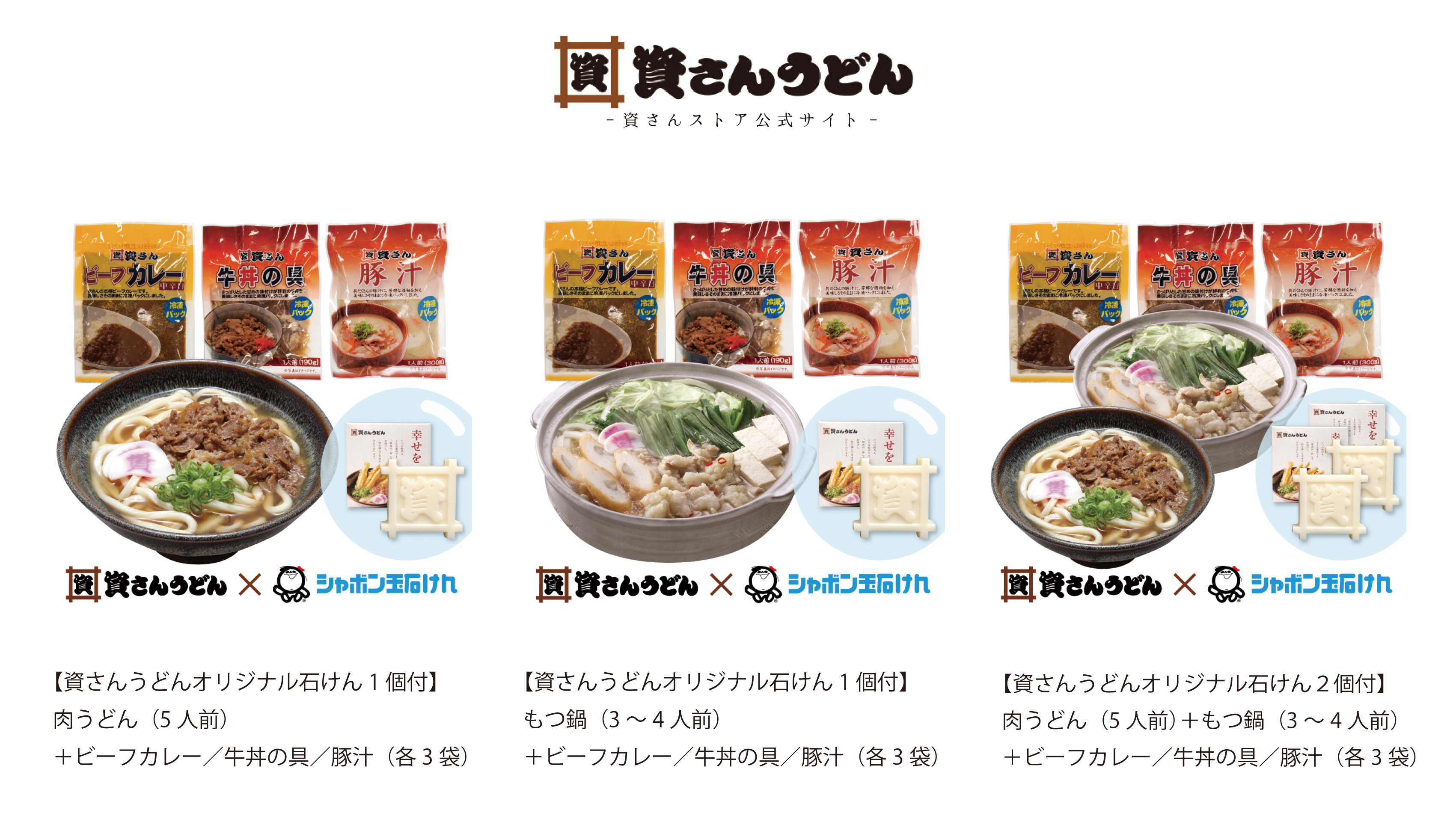 北九州を代表する企業であり、化学物質や合成添加物を一切含まない無添加石けんの製造・販売を行っている「シャボン玉石けん株式会社」とコラボレーションし、資さんうどんオリジナル石けんを製作しました!!無添加石けんのパイオニアである「シャボン玉石けん」と初めてタッグを組んで、北九州発祥の企業同士のコラボレーションが実現!!「資さんうどんオリジナル石けん」が誕生しました!このコラボレーションを記念して、6月1日(月)午前9時~自社通販サイト「資さんストア」内、対象商品ご購入のお客さまに「資さんうどんオリジナル石けん」をもれなくプレゼントさせて頂きます!北九州発祥の企業同士が製作した激レアコラボ石けんを入手するチャンスをぜひ、お見逃しなく!