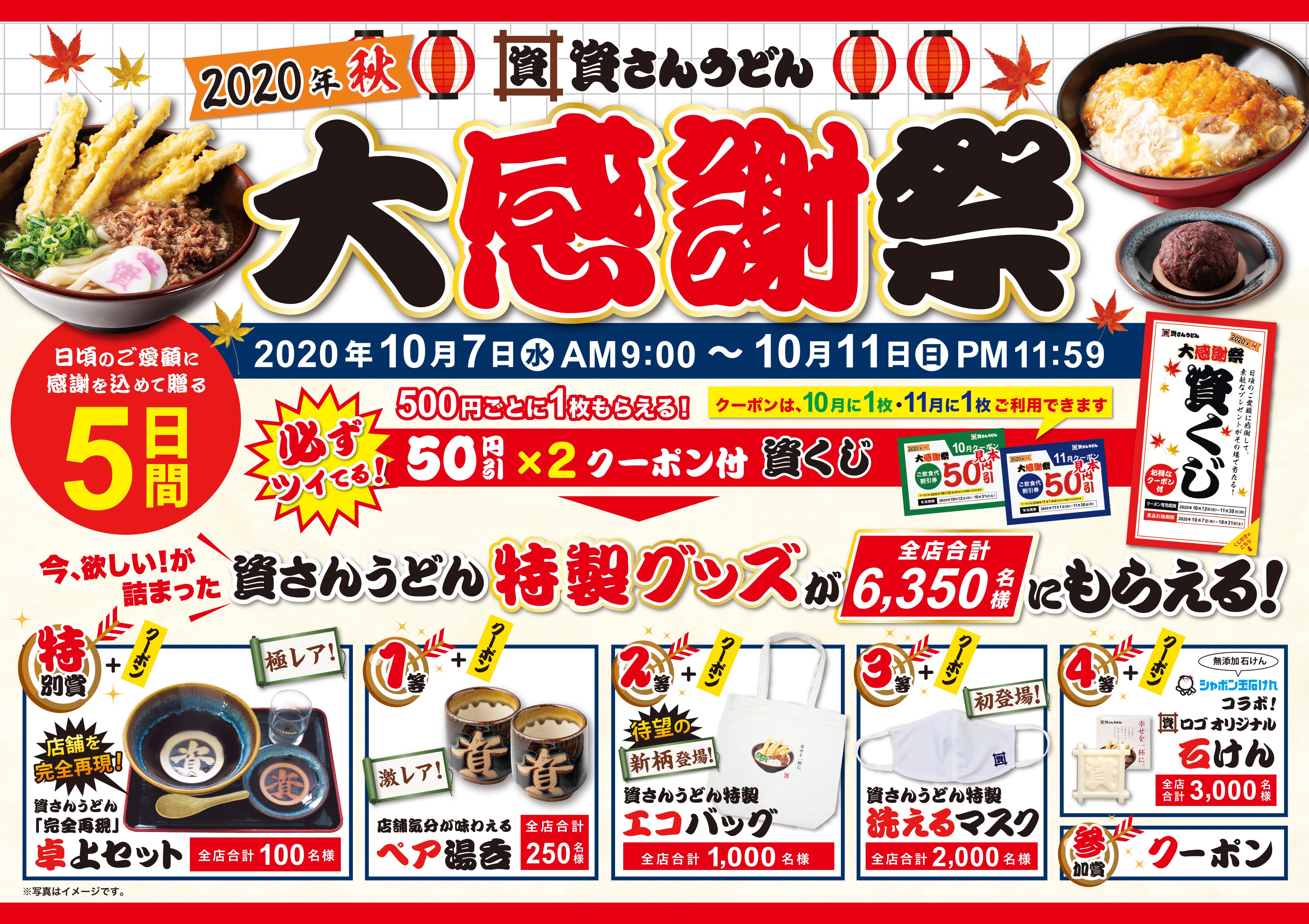 日頃より「資さんうどん」をご愛顧頂いているお客さまへの感謝の気持ちとして、10月7日(水)午前9時~11日(日)までの5日間、年に一度の「”2020年秋” 大感謝祭」を開催します!今年は「資さんうどん」店舗でのお食事を”完全再現”できる「卓上セット」等、激レア「資さんうどん」特製オリジナルグッズが5日間で計6,350名さまに当たります!(古賀店は店内改装中のため、10月8日(木)午前10時~となります。何卒、ご了承ください。)