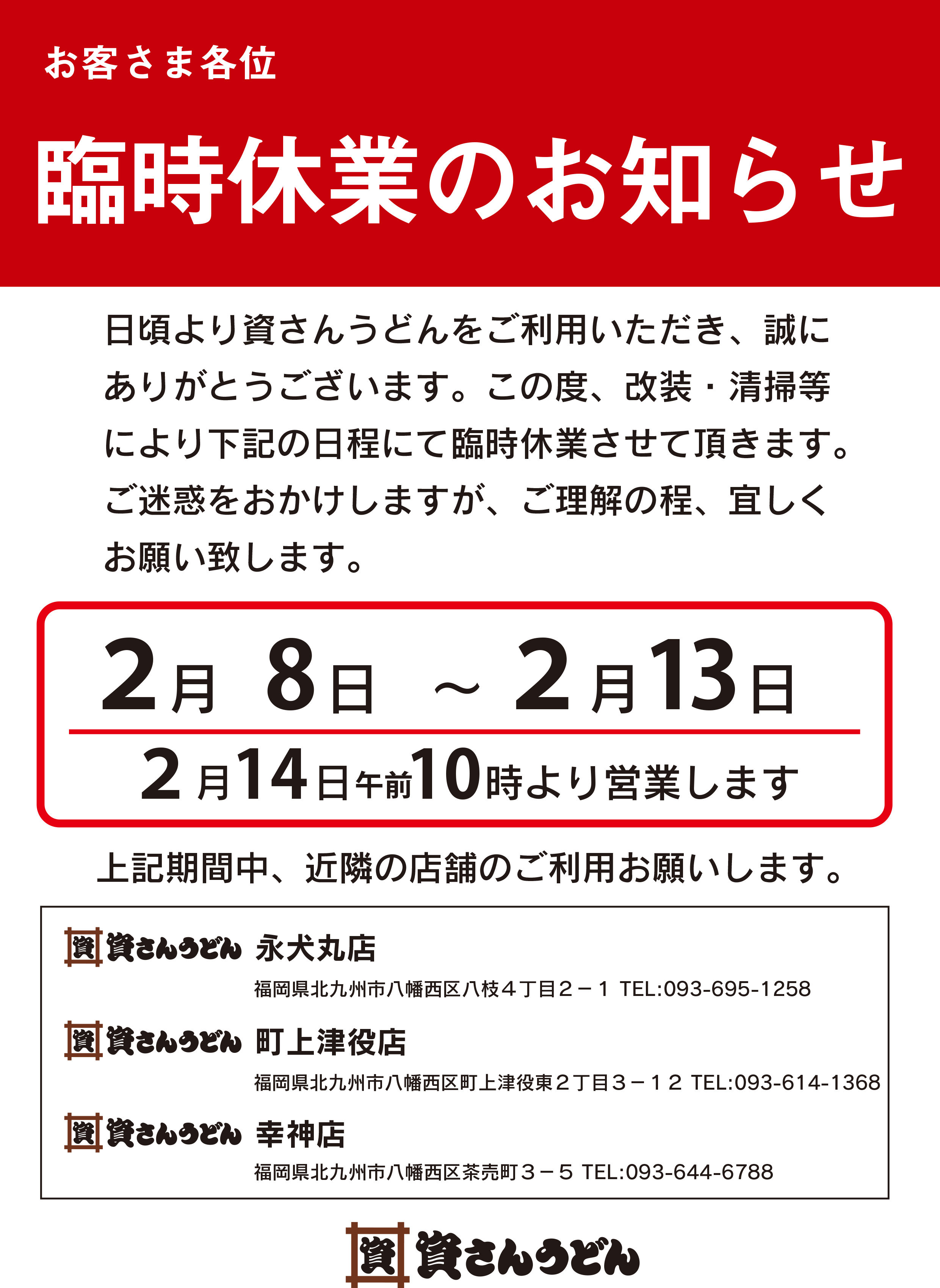 資さんうどん中間店は、店舗改装により、2月8日(月)~2月14日(日)午前10時まで臨時休業とさせて頂きます。営業再開日は、2月14日(日)午前10時~となります。2月7日(日)の営業につきましては、店内飲食朝5時~20時(ラストオーダー19:30まで)、お持ち帰りのご対応は21時までとさせて頂きます。日頃より中間店ご愛顧いただいておりますお客さまにはご不便とご迷惑をおかけしますが、何卒、ご理解・ご了承の程、宜しくお願い致します。なお、改装休業中は、最寄りの近隣店舗をご利用頂けますと幸いです。重ねて、宜しくお願い致します。