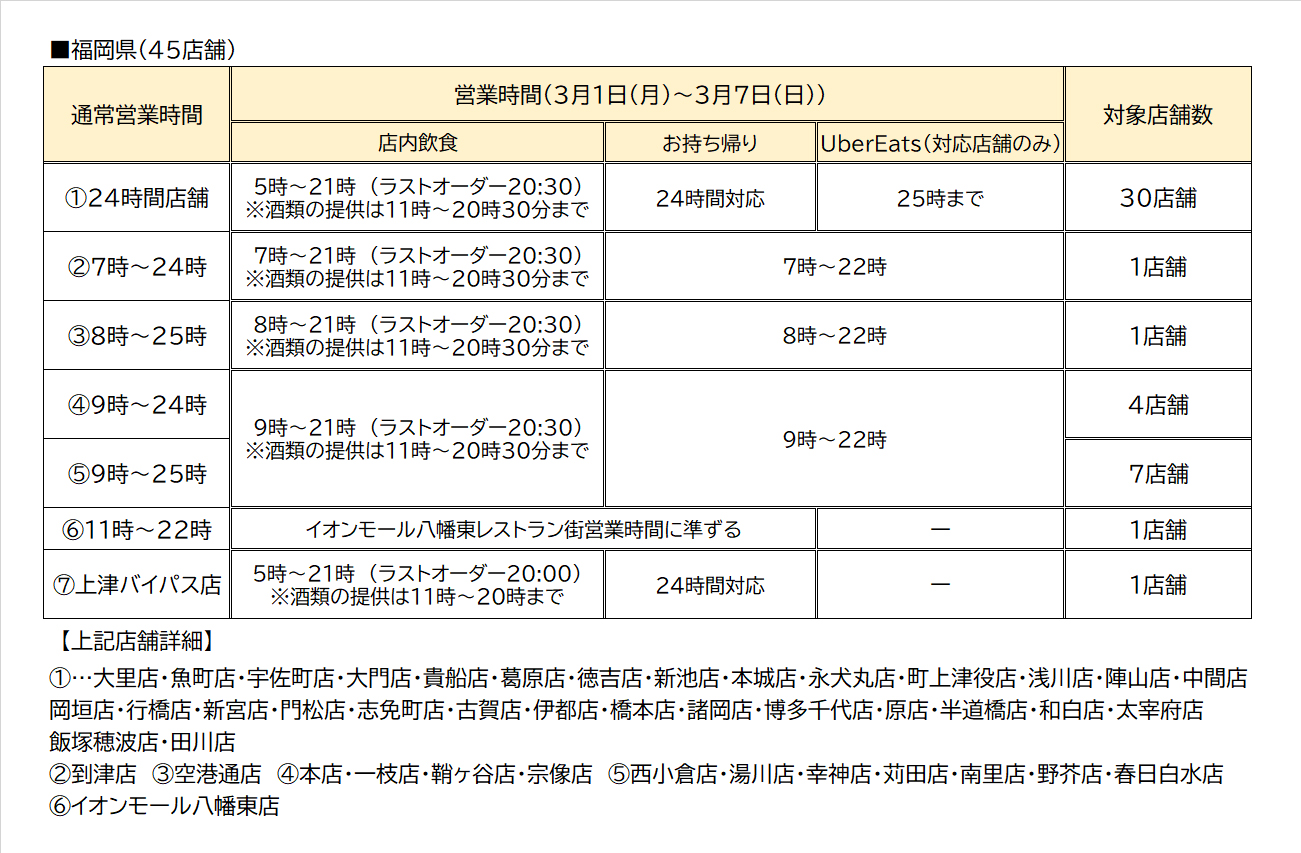 【3月1日(月)~7日(日)福岡県下45店舗営業時間の変更について】