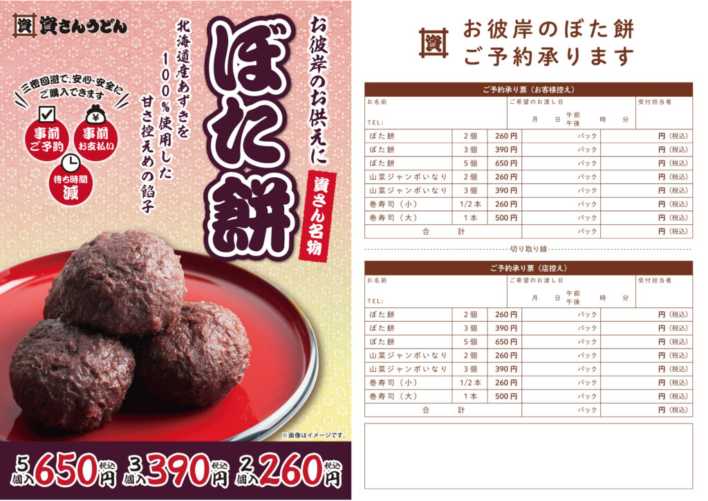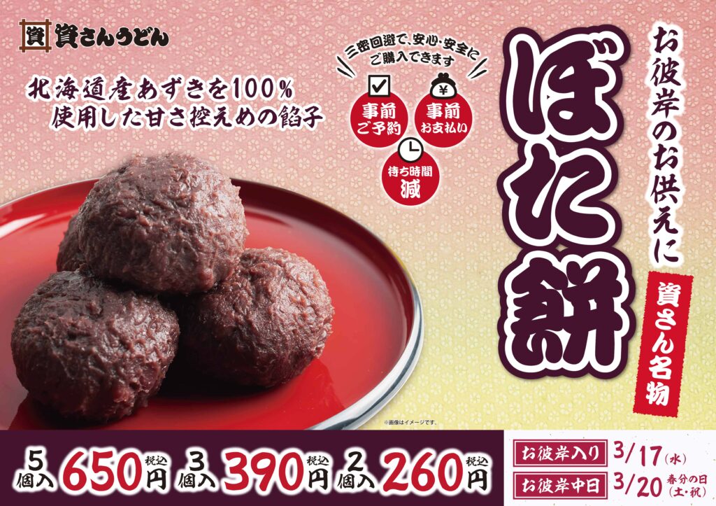 3月17日(水)から始まる春のお彼岸に向けて、北海道産小豆を100%使用した「資さんうどん」名物「ぼた餅」のご予約受付中です!春のお彼岸期間中も店頭にて販売を行いますが、新型コロナウイルス感染症対策および、3密(密閉・密集・密接)回避のため、事前でのご予約・お支払いを頂けますと、待ち時間少なくスムーズなお渡しが出来ます。お彼岸のお供え用として、ぜひ、この機会にご予約ください!