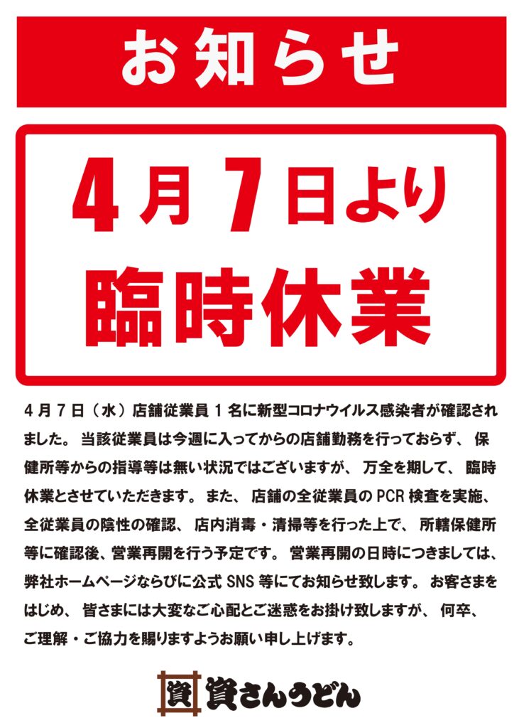 本日4月7日(水)、資さんうどん魚町店従業員1 名に新型コロナウイルス感染者が確認されました。