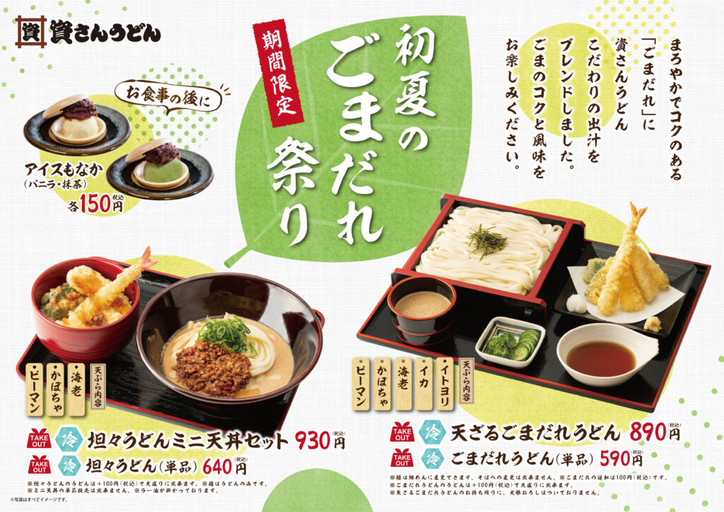 4月26日(月)~期間限定で”初夏のごまだれ祭り”を開催!ごまのコクと風味を味わえるごまだれを使用した”ごまだれうどん”と、人気の”坦々うどん”が今年も登場します!!