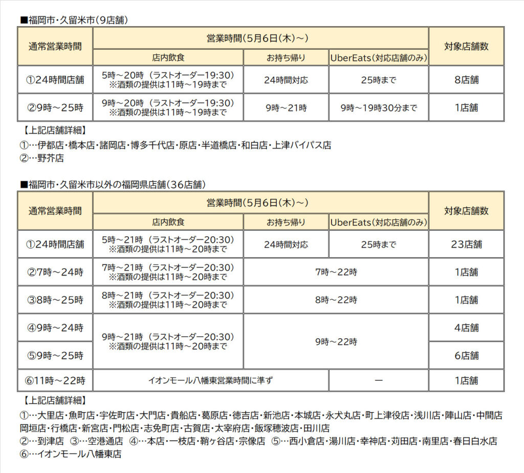 5/6(木)~福岡県下45店舗営業時間の変更について