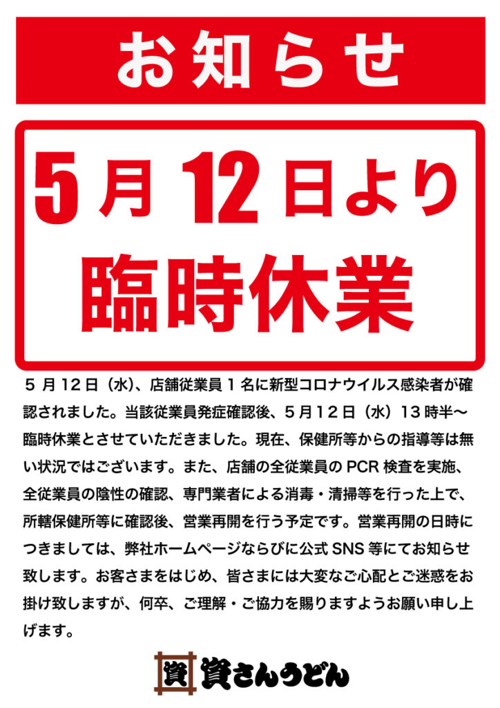 5 月12 日(水) 資さんうどん古賀店店舗従業員1 名に新型コロナウイルス感染者が確認されました。当該従業員発症確認後、5月12日(水)13時半~臨時休業とさせていただきました。現在、保健所等からの指導等は無い状況ではございます。また、店舗の全従業員のPCR 検査を実施、全従業員の陰性の確認、専門業者による消毒・清掃等を行った上で、所轄保健所等に確認後、営業再開を行う予定です。営業再開の日時につきましては、弊社ホームページならびに公式SNS 等にてお知らせ致します。お客さまをはじめ、皆さまには大変なご心配とご迷惑をお掛け致しますが、何卒、ご理解・ご協力を賜りますようお願い申し上げます。