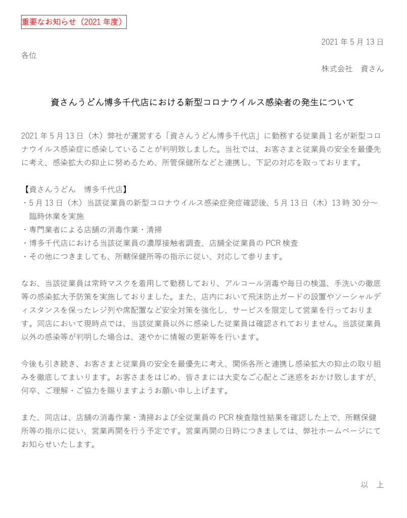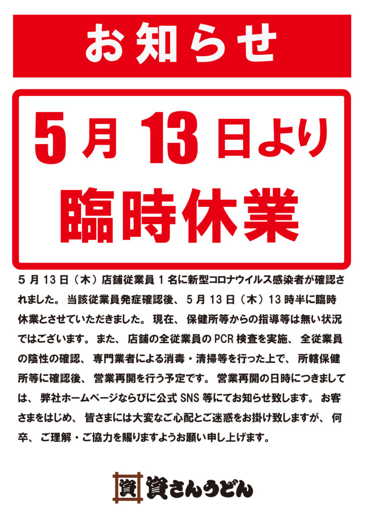 5月13日(木) 資さんうどん博多千代店店舗従業員1 名に新型コロナウイルス感染者が確認されました。当該従業員発症確認後、5月13日(木)13時半~臨時休業とさせていただきました。現在、保健所等からの指導等は無い状況ではございます。また、店舗の全従業員のPCR 検査を実施、全従業員の陰性の確認、専門業者による消毒・清掃等を行った上で、所轄保健所等に確認後、営業再開を行う予定です。営業再開の日時につきましては、弊社ホームページならびに公式SNS 等にてお知らせ致します。お客さまをはじめ、皆さまには大変なご心配とご迷惑をお掛け致しますが、何卒、ご理解・ご協力を賜りますようお願い申し上げます。
