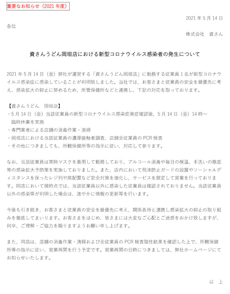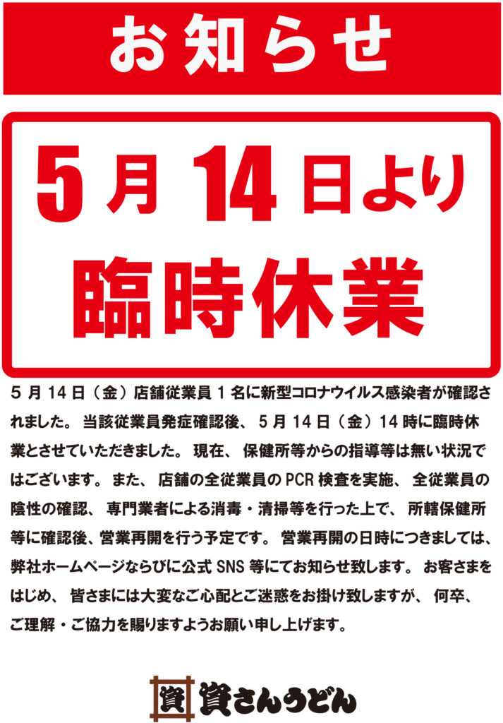 5月14日(金) 資さんうどん岡垣店店舗従業員1 名に新型コロナウイルス感染者が確認されました。当該従業員発症確認後、5月14日(金)14時~臨時休業とさせていただきました。現在、保健所等からの指導等は無い状況ではございます。また、店舗の全従業員のPCR 検査を実施、全従業員の陰性の確認、専門業者による消毒・清掃等を行った上で、所轄保健所等に確認後、営業再開を行う予定です。営業再開の日時につきましては、弊社ホームページならびに公式SNS 等にてお知らせ致します。お客さまをはじめ、皆さまには大変なご心配とご迷惑をお掛け致しますが、何卒、ご理解・ご協力を賜りますようお願い申し上げます。