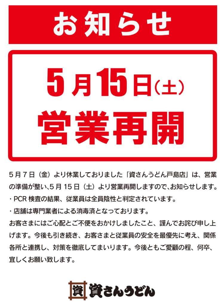 5/7(金)〜休業しておりました 熊本市東区の資さんうどん 戸島店は、本日5/15(土)7時〜無事営業再開させて頂きました。従業員全員のPCR検査陰性の確認、専門業者による消毒・検査の完了を以って、営業を再開しております。今後とも、資さんうどん戸島店のご愛顧の程、宜しくお願い申し上げます。