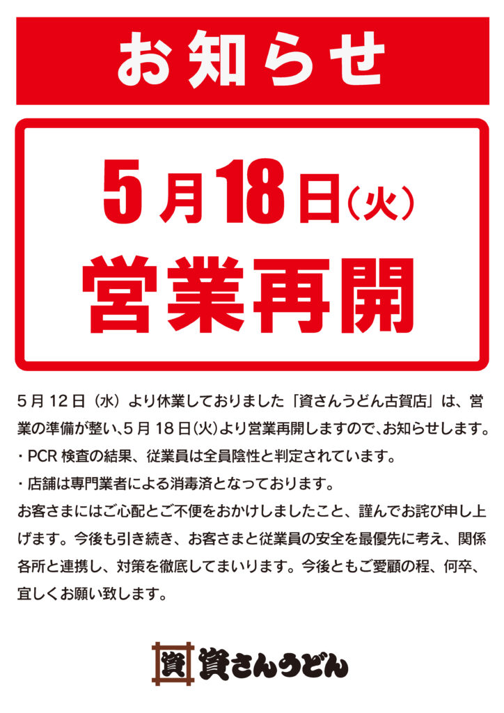 5/10(月)~休業しておりました資さんうどん諸岡店、5/12(水)~休業しておりました資さんうどん古賀店は、明日5/18(火)7時〜営業再開させて頂きます。従業員全員のPCR検査陰性の確認、専門業者による消毒・検査の完了を以って、営業を再開致します。今後とも、資さんうどん諸岡店・古賀店のご愛顧の程、宜しくお願い申し上げます。
