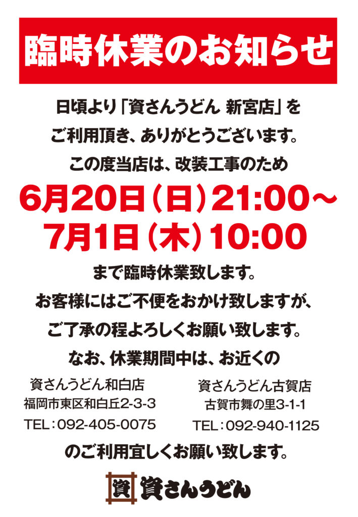 資さんうどん新宮店は、店舗改装のため、6月20日(日)21時~7月1日(木)10時まで休業させて頂きます。お客さまにおかれましては、ご不便・ご迷惑をおかけしますが、何卒、ご理解、ご了承の程、宜しくお願い致します。