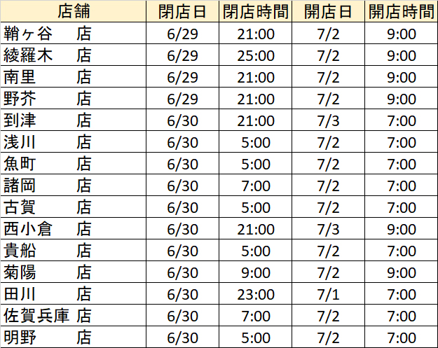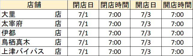 6/29~7/1ワクチン接種による店舗休業のお知らせ