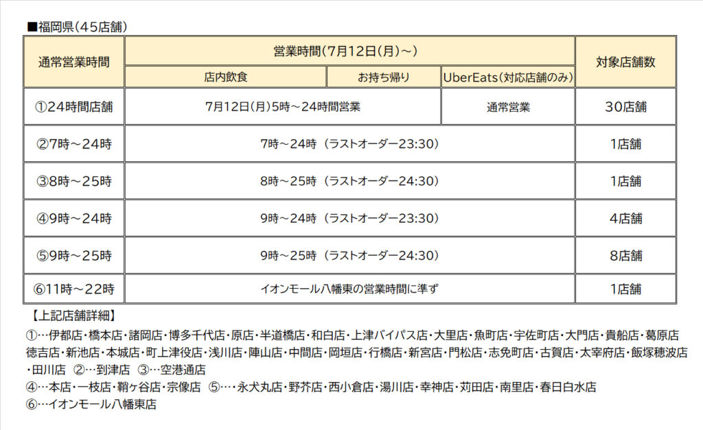 まん延防止等重点措置の解除ならびに福岡県からの飲食店に対する営業時間時短要請が7月12日(月)に解除されることに伴い、福岡県下45店舗の営業時間を7月12日(月)より、下記の営業時間に変更いたします。これまでお客さまにはご不便等おかけしておりましたが、7月12日(月)より通常営業となります。何卒、宜しくお願い致します。※新型コロナワクチン接種による休業店舗がございます。予めご了承下さい。