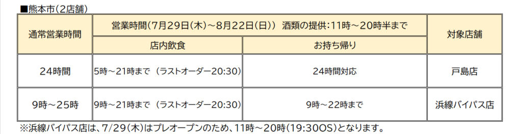 2021年07月28日 資さんうどん 熊本市2店舗営業時間について 資さんうどん 熊本市2店舗営業時間について、熊本県からの熊本市内の飲食店に対する時短営業要請に基づき、7/29(木)〜8/22(日)の期間、下記内容にて営業させて頂きます。お客さまにおかれましては、ご迷惑、ご不便をおかけ致しますが、何卒、ご理解・ご承知の程、宜しくお願い致します。