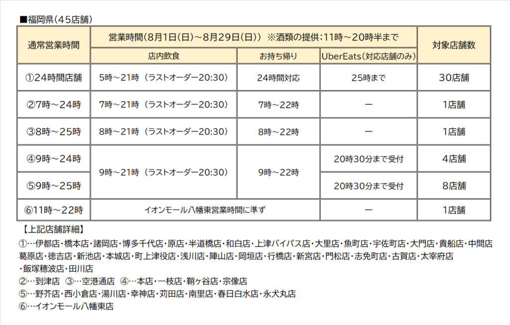 2021年07月28日 資さんうどん福岡県下45店舗の営業時間について 資さんうどん福岡県下45店舗の営業時間について、福岡県からの飲食店に対する時短要請に基づき、8/1(日)〜29(日)の期間、下記営業時間となります。なお、7/31(土)は店内飲食を23時までとさせて頂きます。ご不便・ご迷惑をおかけ致しますが、ご理解・ご了承の程、何卒、宜しくお願い致します。