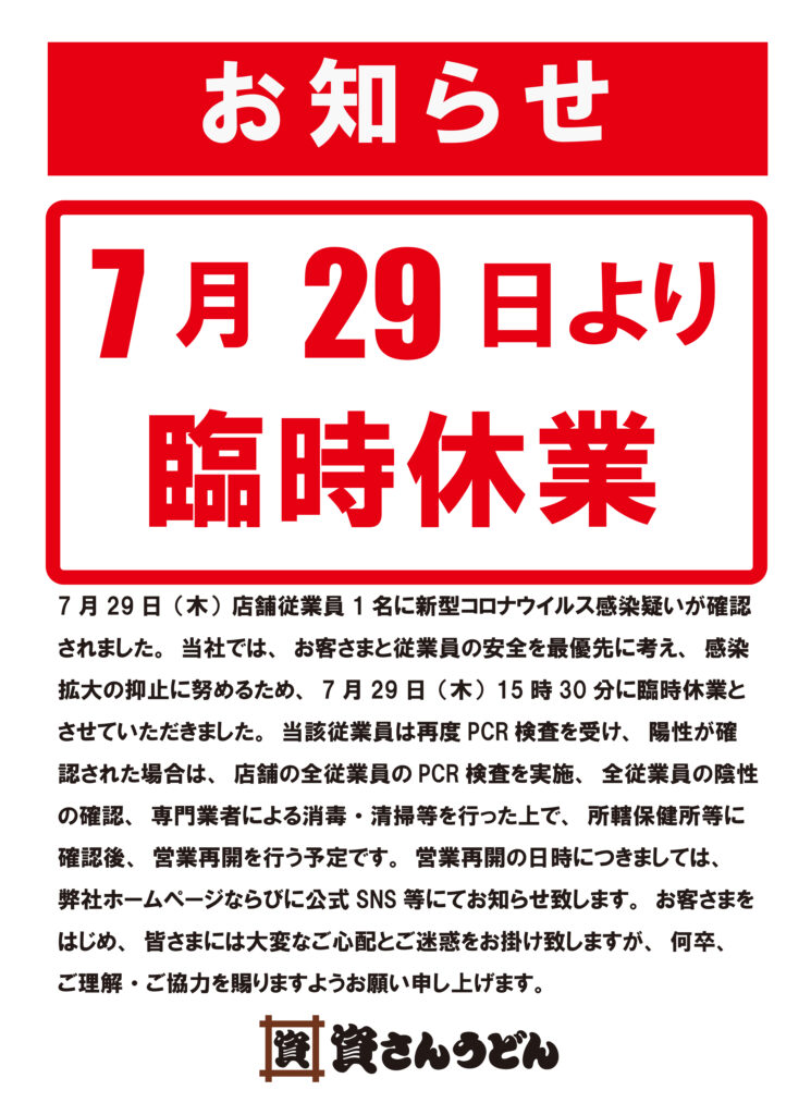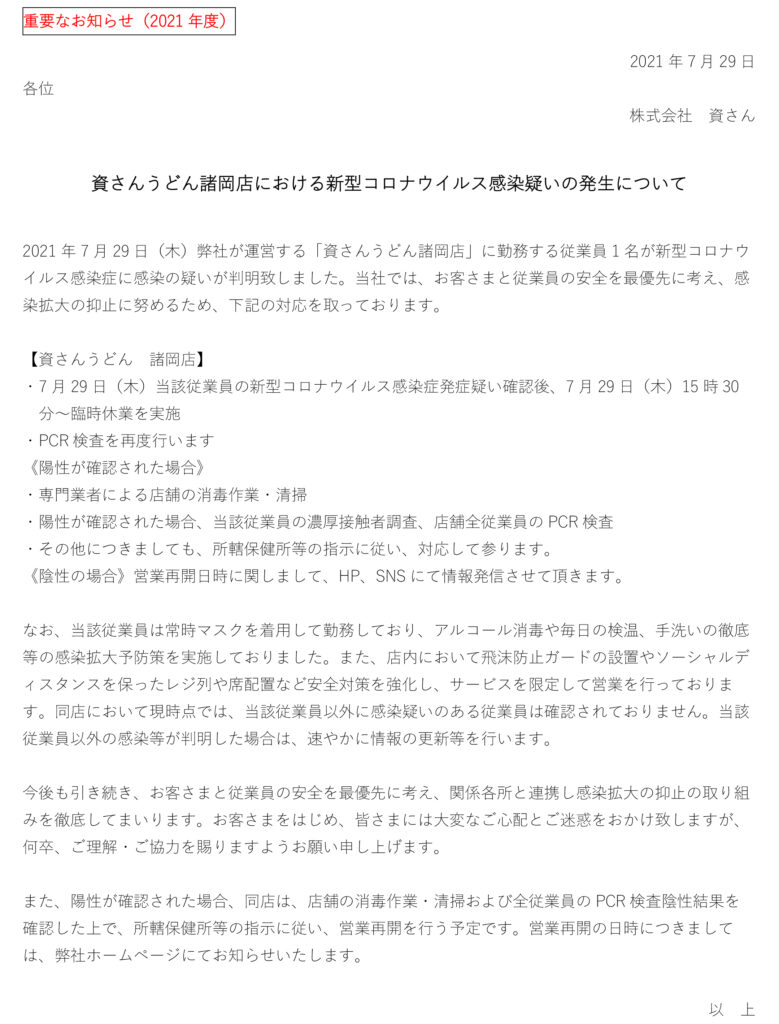 資さんうどん諸岡店における新型コロナウイルス感染疑いの発生について