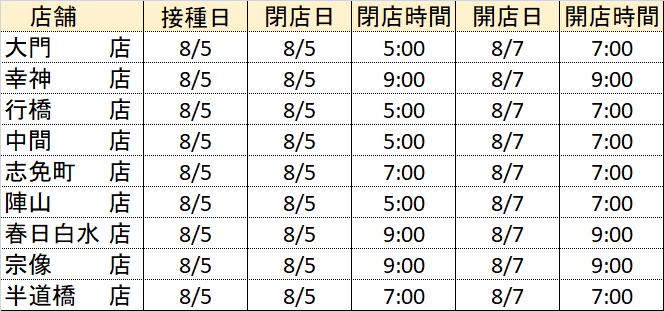 8/5~8/7ワクチン接種による休業のお知らせ