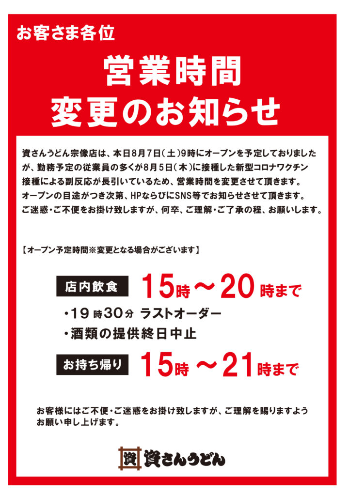 資さんうどん宗像店は、本日8月7日(土)9時にオープンを予定しておりましたが、勤務予定の従業員の多くが8月5日(木)に接種した新型コロナワクチン接種による副反応が長引いているため、営業時間を変更させて頂きます。