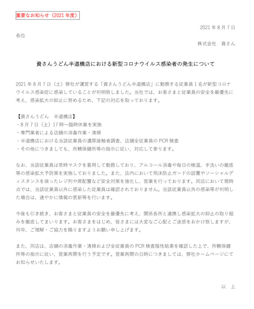 8月7日(土)資さんうどん半道橋店の店舗従業員1名に新型コロナウイルス感染が確認されました。当社では、お客さまと従業員の安全を最優先に考え、感染拡大の抑止に努めるため、8月7日(土)17時に臨時休業とさせていただきました。現在、保健所等からの指導等は無い状況ではございます。また、店舗の全従業員のPCR検査を実施、全従業員の陰性の確認、専門業者による消毒・清掃等を行った上で、所轄保健所等に確認後、営業再開を行う予定です。営業再開の日時につきましては、弊社ホームページならびに公式SNS等にてお知らせ致します。お客さまをはじめ、皆さまには大変なご心配とご迷惑をお掛け致しますが、何卒、ご理解・ご協力を賜りますようお願い申し上げます。