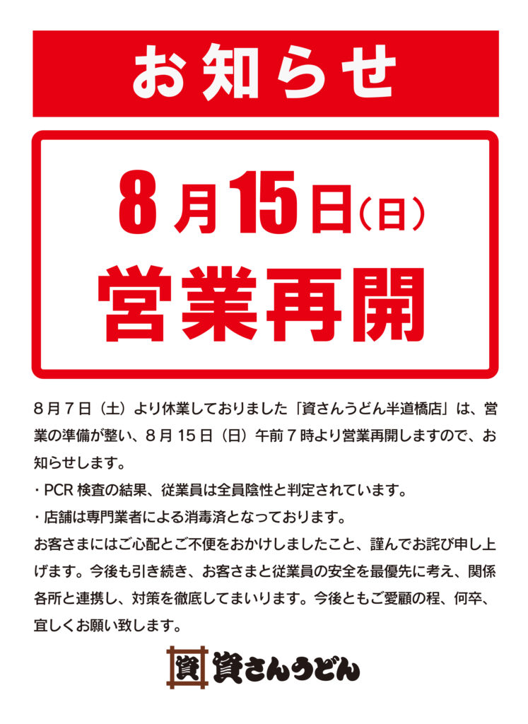 8/7(土)〜休業しておりました 資さんうどん半道橋店は、明日8/15(日)7時〜営業を再開させて頂きます。従業員全員のPCR検査陰性の確認、専門業者による消毒・検査の完了を以って、営業を再開致します。今後とも、資さんうどん半道橋店をご愛顧の程、宜しくお願い申し上げます。