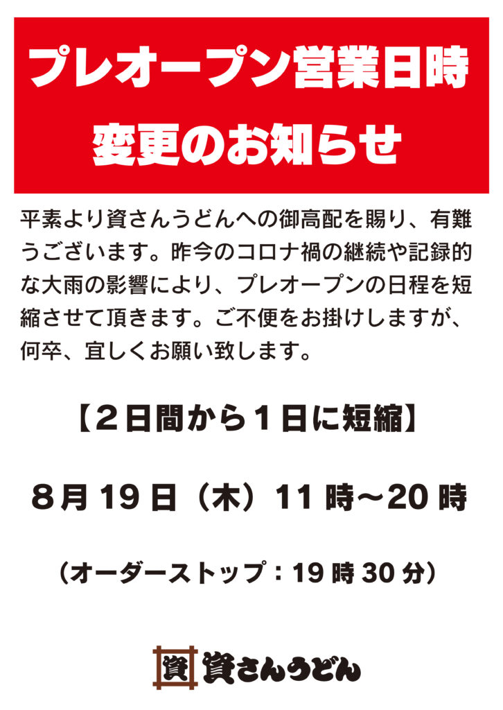 平素より資さんうどんへの御高配を賜り、有難うございます。昨今のコロナ禍の継続や記録的な大雨の影響により、プレオープンの日程を短縮させて頂きます。ご不便をお掛けしますが、何卒、宜しくお願い致します。
