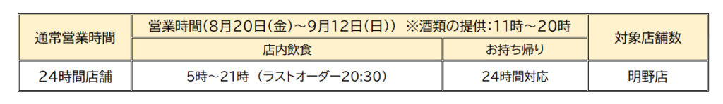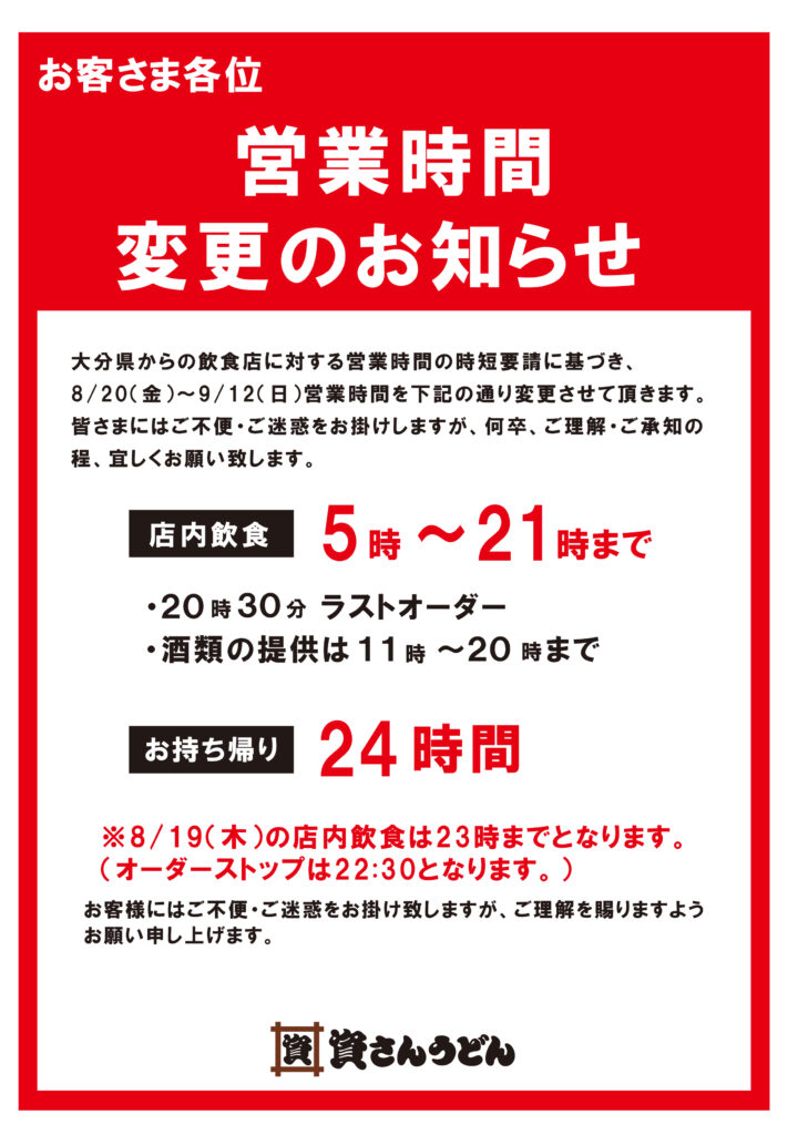 8/20(金)~9/12(日)資さんうどん明野店営業時間変更