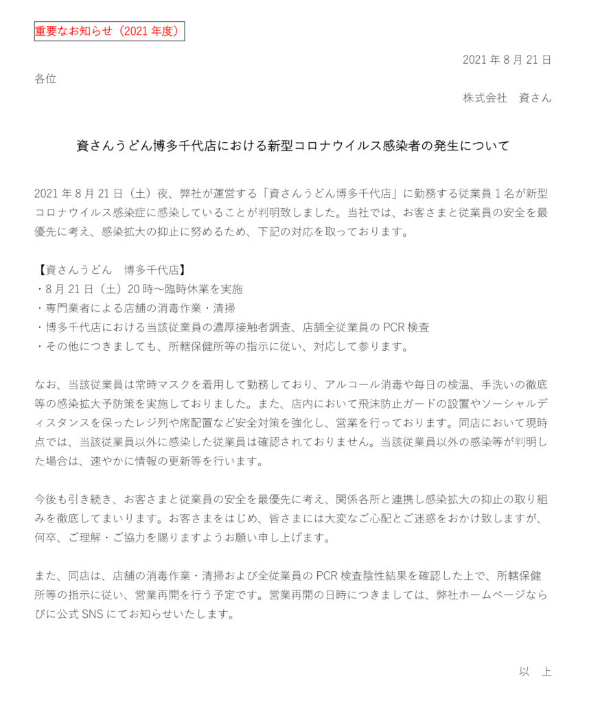 8月21日(土)夜、当社が運営する資さんうどん博多千代店に勤務する店舗従業員1名に新型コロナウイルス感染が確認されました。当社では、お客さまと従業員の安全を最優先に考え、感染拡大の抑止に努めるため、8月21日(土)20時に臨時休業とさせていただきました。現在、保健所等からの指導等は無い状況ではございます。また、店舗の全従業員のPCR検査を実施、全従業員の陰性の確認、専門業者による消毒・清掃等を行った上で、所轄保健所等に確認後、営業再開を行う予定です。営業再開の日時につきましては、弊社ホームページならびに公式SNS等にてお知らせ致します。お客さまをはじめ、皆さまには大変なご心配とご迷惑をお掛け致しますが、何卒、ご理解・ご協力を賜りますようお願い申し上げます。