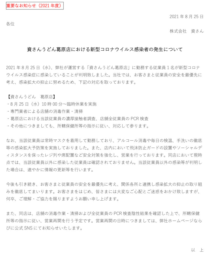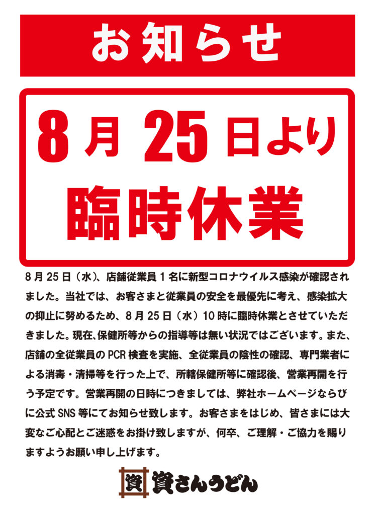 8 月25 日(水)、当社が運営する資さんうどん葛原店の店舗従業員1 名に新型コロナウイルス感染が確認されました。当社では、お客さまと従業員の安全を最優先に考え、感染拡大の抑止に努めるため、8 月25 日(水)10 時に臨時休業とさせていただきました。現在、保健所等からの指導等は無い状況ではございます。また、店舗の全従業員のPCR 検査を実施、全従業員の陰性の確認、専門業者による消毒・清掃等を行った上で、所轄保健所等に確認後、営業再開を行う予定です。営業再開の日時につきましては、弊社ホームページならびに公式SNS 等にてお知らせ致します。お客さまをはじめ、皆さまには大変なご心配とご迷惑をお掛け致しますが、何卒、ご理解・ご協力を賜りますようお願い申し上げます。