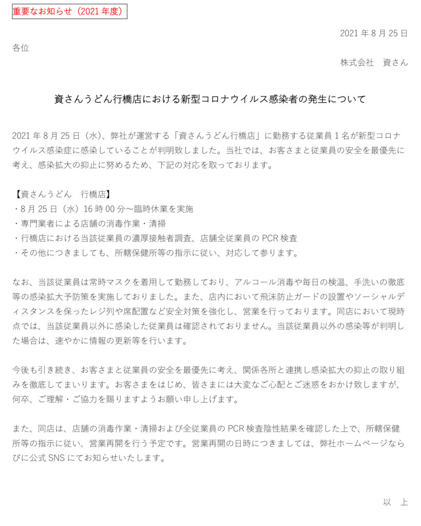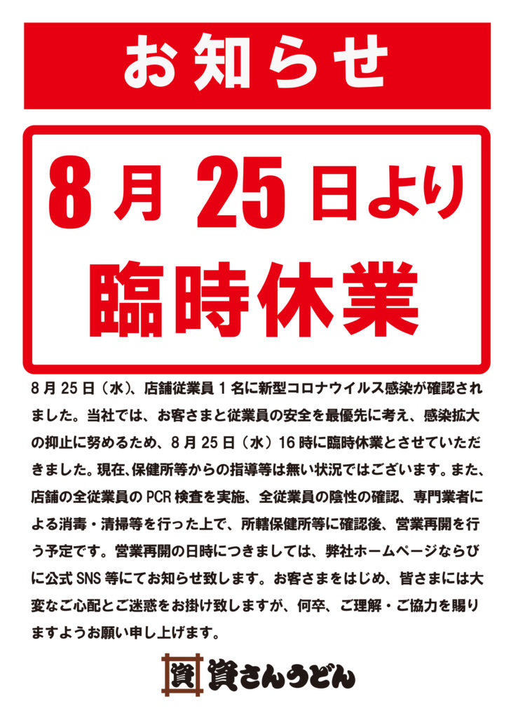 8 月25 日(水)、当社が運営する資さんうどん行橋店の店舗従業員1 名に新型コロナウイルス感染が確認されました。当社では、お客さまと従業員の安全を最優先に考え、感染拡大の抑止に努めるため、8 月25 日(水)16 時に臨時休業とさせていただきました。現在、保健所等からの指導等は無い状況ではございます。また、店舗の全従業員のPCR 検査を実施、全従業員の陰性の確認、専門業者による消毒・清掃等を行った上で、所轄保健所等に確認後、営業再開を行う予定です。営業再開の日時につきましては、弊社ホームページならびに公式SNS 等にてお知らせ致します。お客さまをはじめ、皆さまには大変なご心配とご迷惑をお掛け致しますが、何卒、ご理解・ご協力を賜りますようお願い申し上げます。