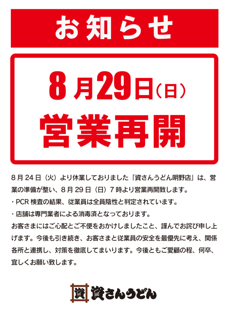 8/24(火)〜休業しておりました資さんうどん明野店は、明日8/29(日)7時〜営業を再開致します。従業員全員のPCR検査陰性の確認、専門業者による消毒・検査の完了を以って、営業を再開致します。お客さまにはご心配とご不便をおかけしましたこと、謹んでお詫び申し上げます。今後も引き続き、お客さまと従業員の安全を最優先に考え、関係各所と連携し、対策を徹底してまいります。今後ともご愛顧の程、何卒、宜しくお願い致します。