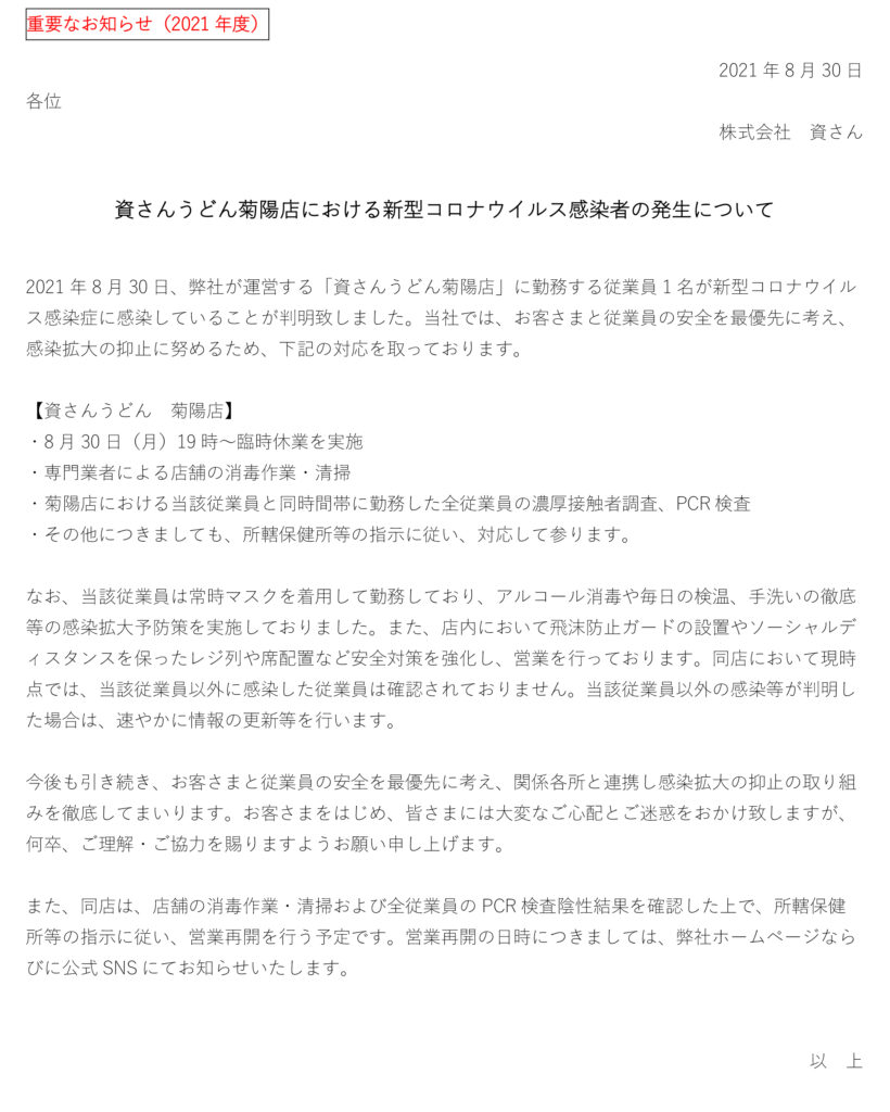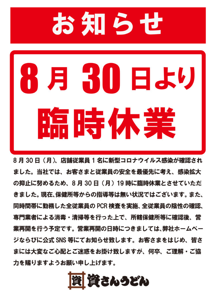 8 月30 日(月)、店舗従業員1 名に新型コロナウイルス感染が確認されました。当社では、お客さまと従業員の安全を最優先に考え、感染拡大の抑止に努めるため、8 月30 日(月)19 時に臨時休業とさせていただきました。現在、保健所等からの指導等は無い状況ではございます。また、同時間帯に勤務した全従業員のPCR 検査を実施、全従業員の陰性の確認、専門業者による消毒・清掃等を行った上で、所轄保健所等に確認後、営業再開を行う予定です。営業再開の日時につきましては、弊社ホームページならびに公式SNS 等にてお知らせ致します。お客さまをはじめ、皆さ